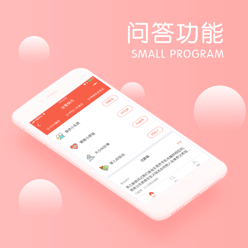 一款问答小程序,内含特邀专业答主,包含健康、情感、女性等各类问题,100%应答,极速回应等功能。